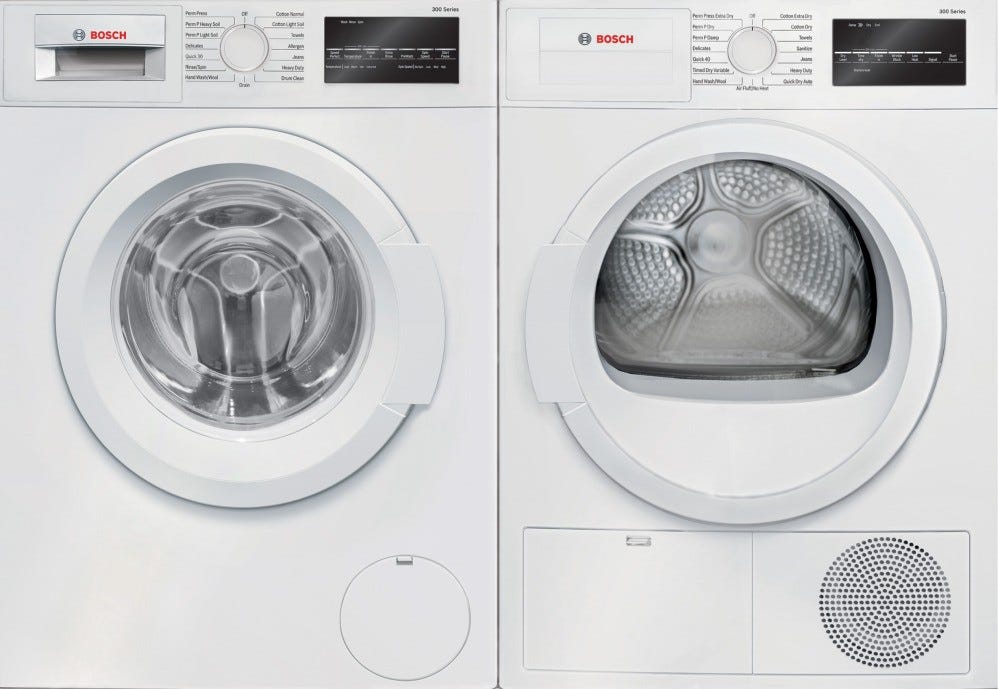 Bosch® White Front Load Laundry Pair with a 2.2 cu. ft. capacity washer and 4.0 cu. ft. capacity electric dryer.Read More