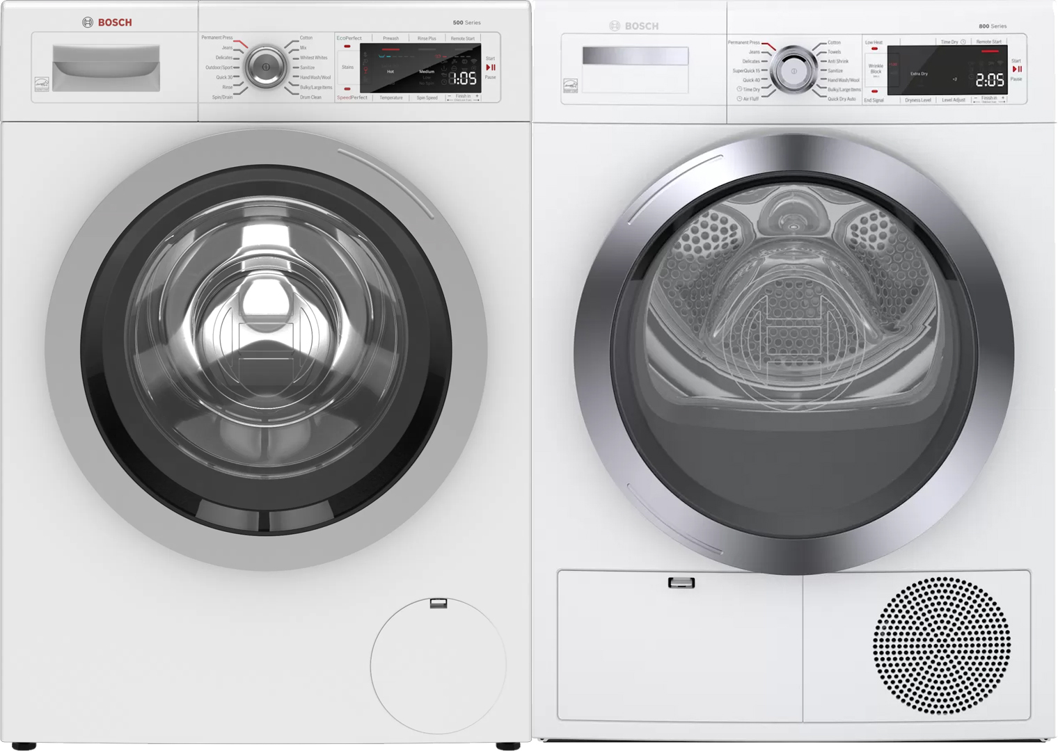Bosch® 500 Series White Front Load Laundry Pair with a 2.2 cu. ft. capacity washer and a 4.0 cu. ft. capacity electric dryer.Read More