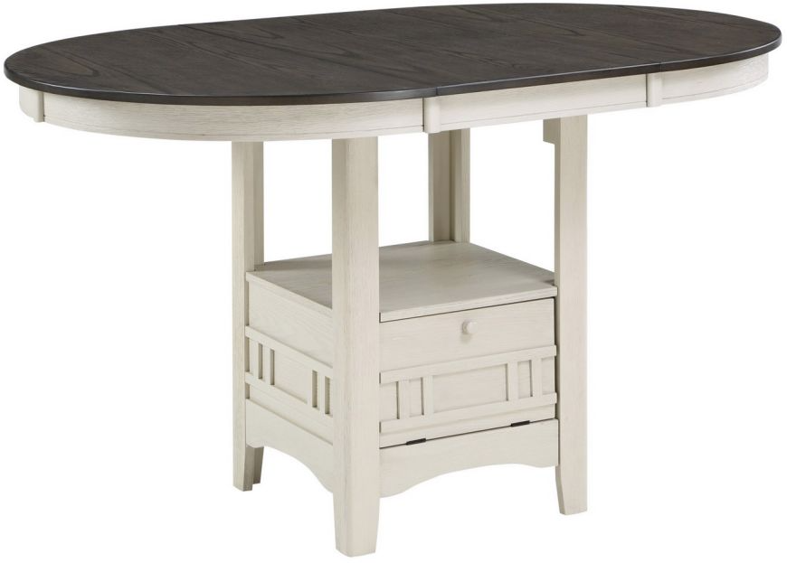 The counter height pedestal table base supports an oval top and features storage accessible behind the drop-panel door. Framing, unique to the classic style comprises design of the table base. The white finish over oak veneer serves to highlight the wood’s grain.Read More