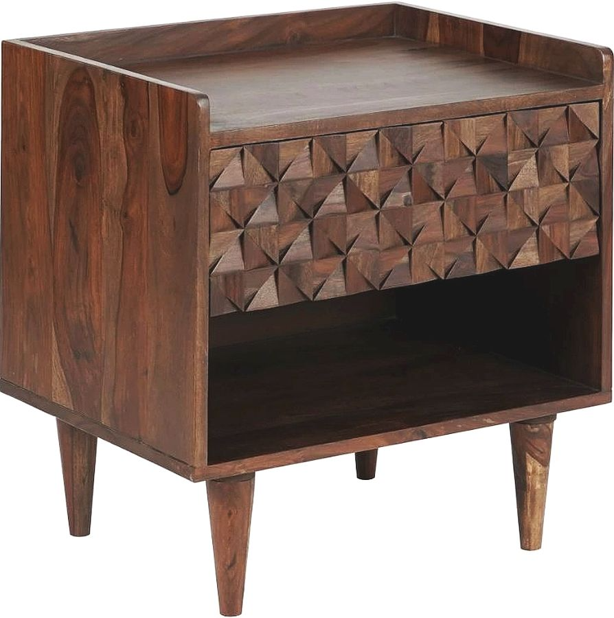 Crafted in solid sheesham wood with a dark walnut finish, the Pablo nightstand features an intricately designed front with each piece carefully arranged by hand. A single drawer with a safety stop provides ample storage, while a finished back allows this piece to float through the bedroom space.Read More