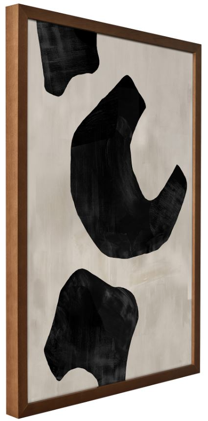 The Wells framed painting features black shapes made focal against a warm grey backdrop. Curved shapes add playfulness to this graphic abstract piece. The warm brown finish of the solid pine frame highlights the presentation with a vintage feel.Read More