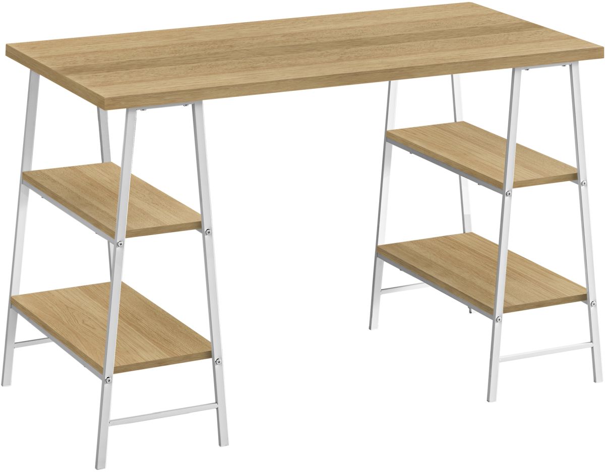 Sawhorse-style legs in white metal are put to work as supports for four open shelves that can be used to display books, small storage boxes, or other items. The unique, compact design of this industrial-style writing desk maximizes space and storage potential so that you can maximize productivity.