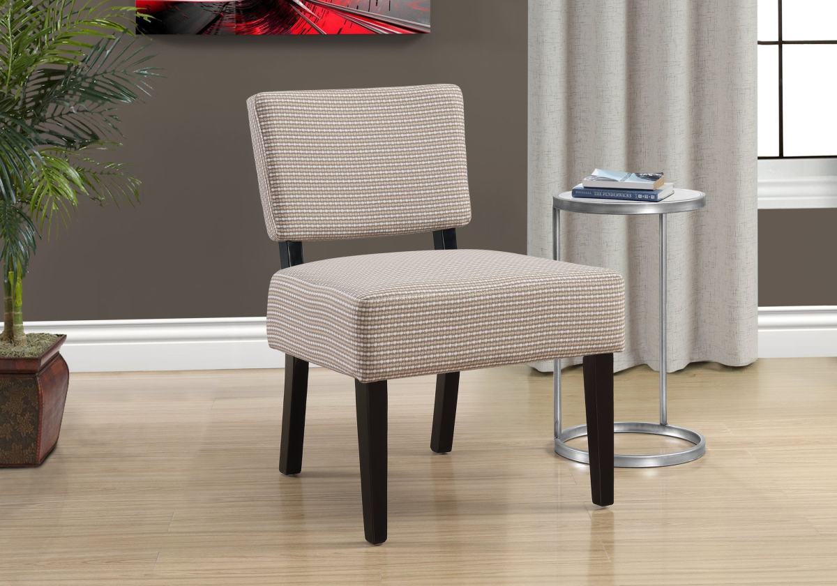 Upholstered armless accent chair in a two-tone taupe abstract dot fabric