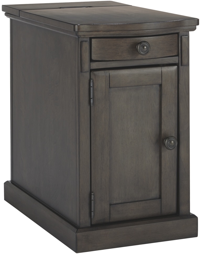 The Laflorn chairside table with bronze-tone hardware keeps everything at reach with a pull-out tray that features a remote control slot & 2 cupholders, and a built-in magazine holder. Devices stay charged thanks to 3 USB ports under a discreet flip-top compartment.