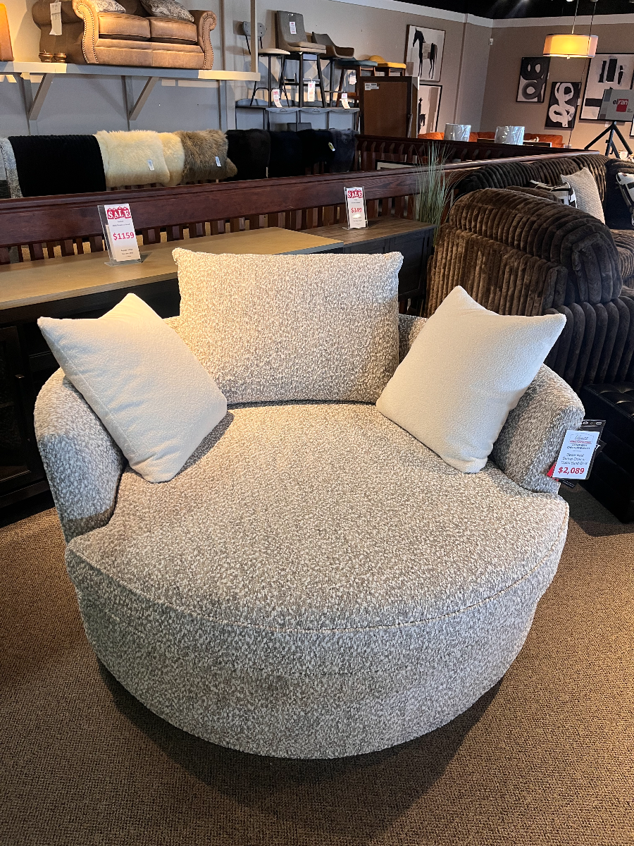 Round out your living room with the contemporary curves of this chair lounger. This inviting swivel chair beckons you to kick off your shoes and snuggle up. A tight barrel back completes the circle with a loose back pillow and several oversized throw pillows.Read More