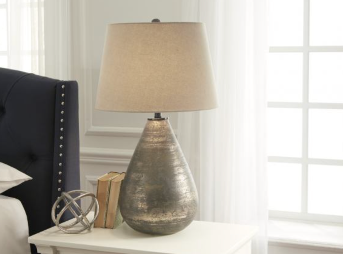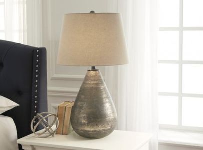 Taber Glass Table Lamp in Antique Gray L430274The art of distressing really comes to light in the Taber table lamp. Opaque teardrop glass base is simply stunning, with perfectly imperfect “weatherworn” charm and a sense of earthy elegance.Distressed Grey Finished Glass Table Lamp. Modified Drum Shade. 3-Way Switch. Type A Bulb - 150 Watts Max or 25 Watts Max CFL.Read More